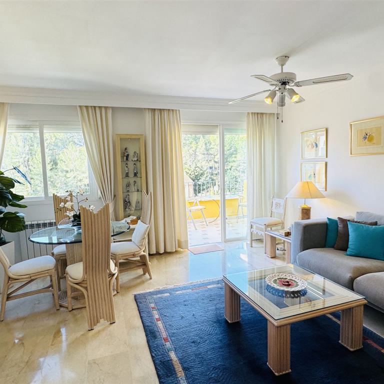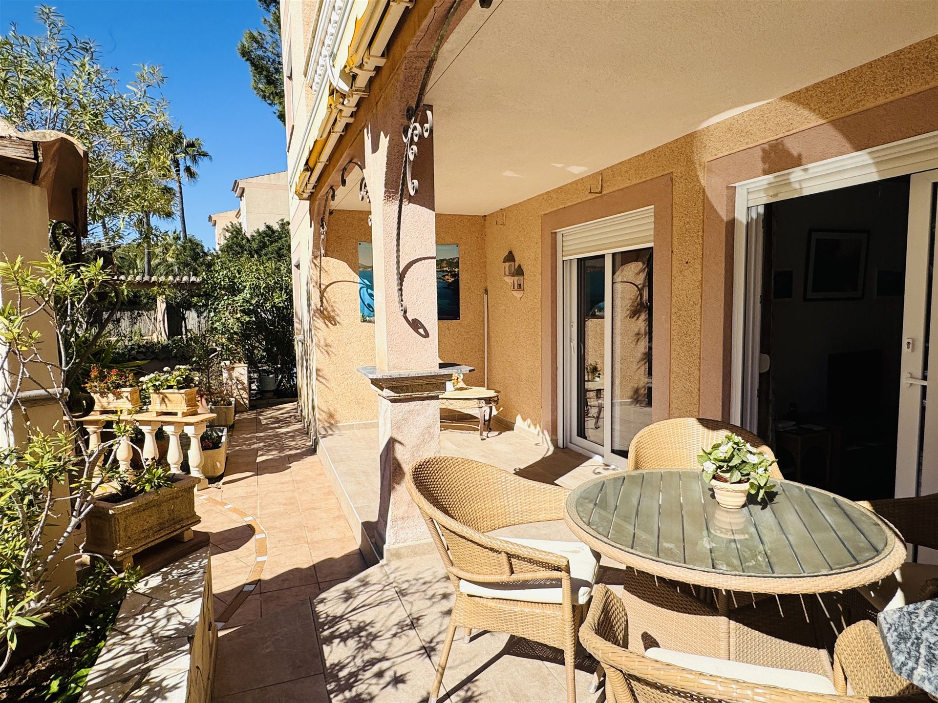 schönes Gartenappartment mit 80 qm Wohnfl, großer sonniger Garten mit Aussendusche, 2 SZ, 1 Bad, Gäste WC, Wohn-Esszimmer, Einbauküche mit angrenzendem Wirtschaftsraum, Klima, Doppelverglasung, Rolladen, privater Tiefgaragenplatz, BJ 1995, komplett möbliert, G-Pool, nahe Strand und Boulevard