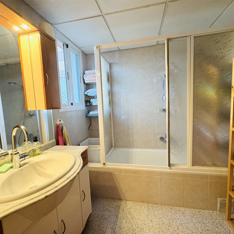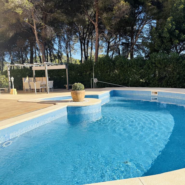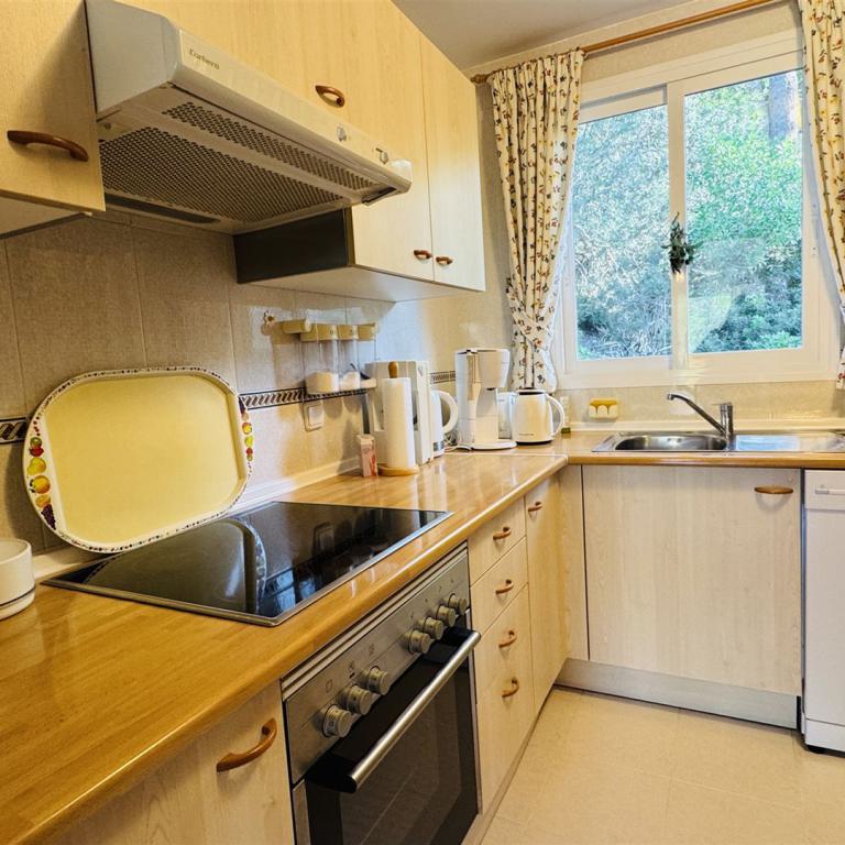 kernsaniertes Gartenappartment nahe Malgrat Felsen mit 90 qm Wohnfl., 24 qm Terrasse, 40 qm Garten, 3 SZ, 2 Bäder, offener Wohn-Essbereich mit Kamin, offene Einbauküche, Wirtschaftsraum, Kellerraum, Klima, Doppelverglasung, privater Stellplatz, G-Pool