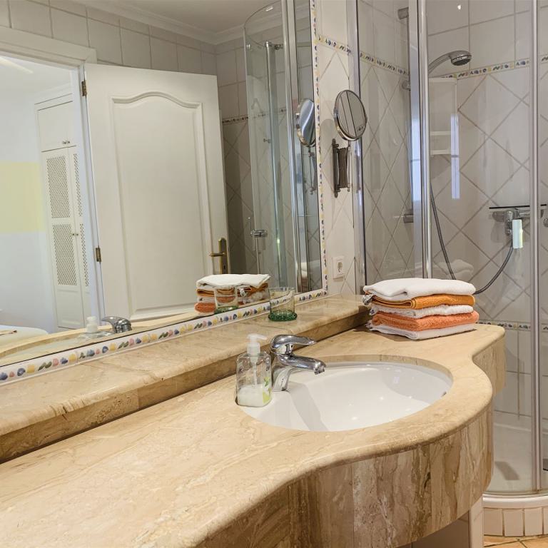 1 Gartenappartment mit 79 qm Wohnfläche 2 Schlafzimmer 2 Bäder Wohn-Esszimmer Küchenzeile Doppelverglasung Ölzentralheizung teilweise überdachte Terrasse Garten Stellplatz Gemeinschaftspool