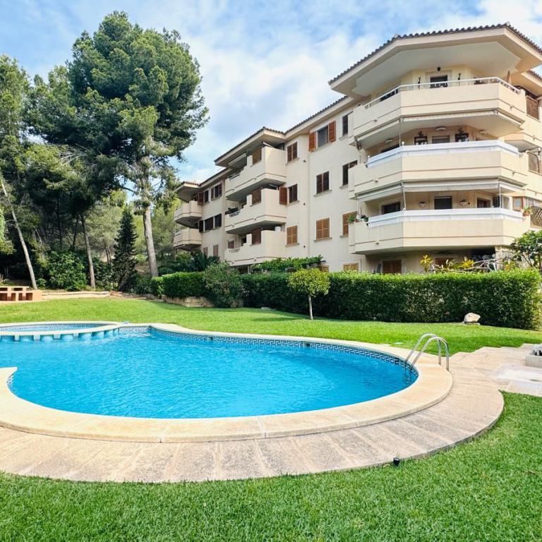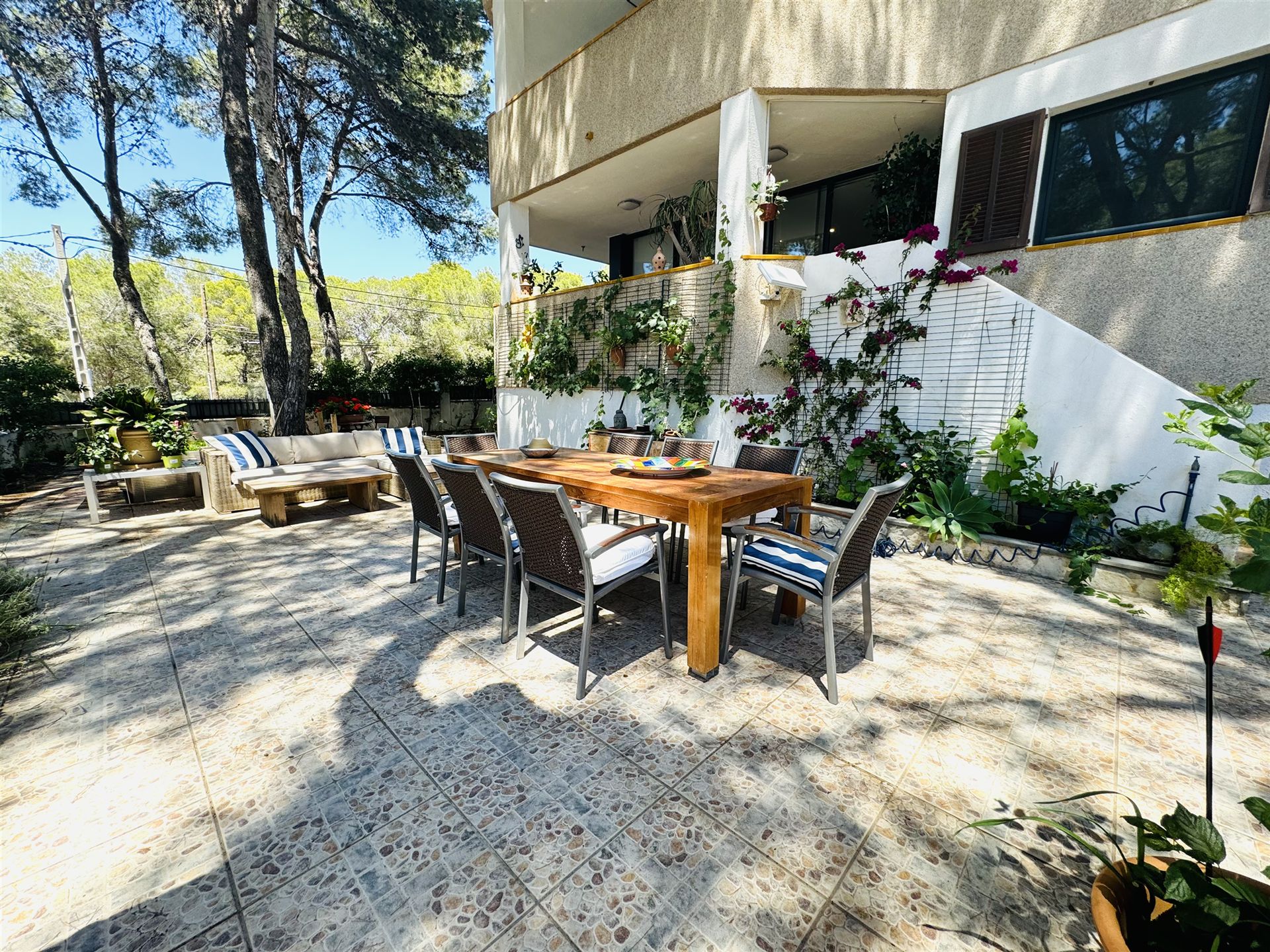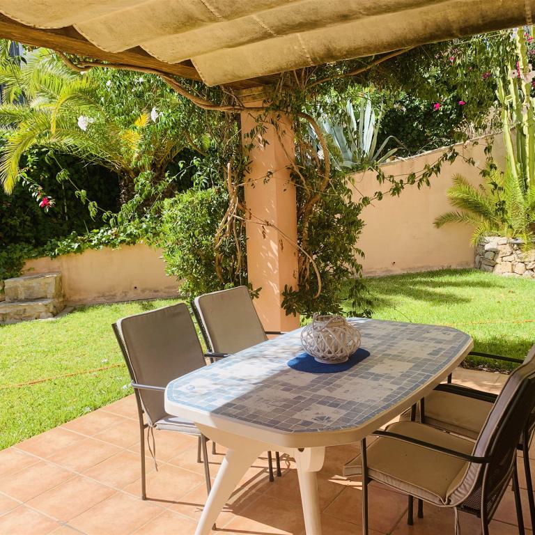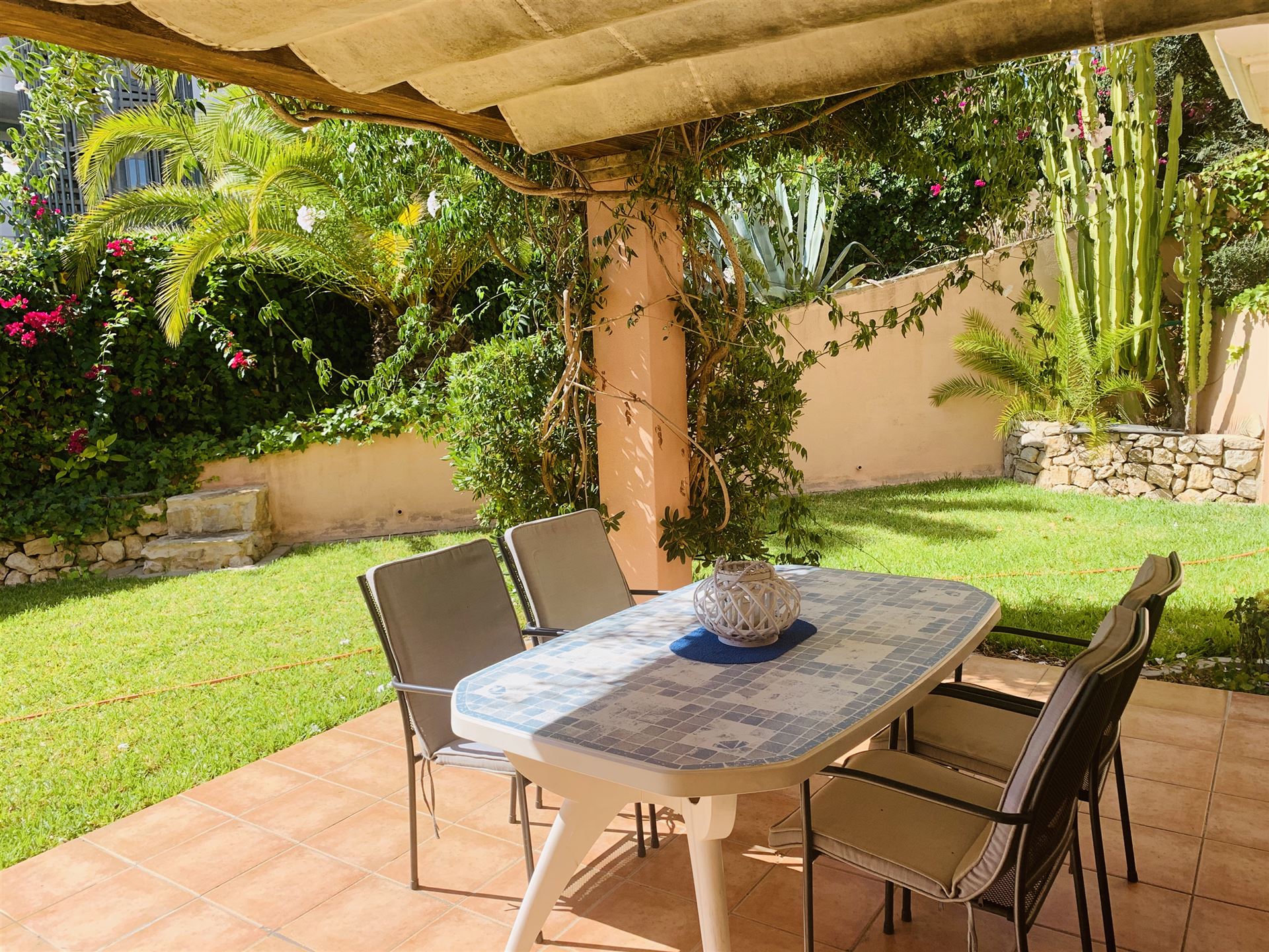 schönes Gartenappartment mit 80 qm Wohnfl, großer sonniger Garten mit Aussendusche, 2 SZ, 1 Bad, Gäste WC, Wohn-Esszimmer, Einbauküche mit angrenzendem Wirtschaftsraum, Klima, Doppelverglasung, Rolladen, privater Tiefgaragenplatz, BJ 1995, komplett möbliert, G-Pool, nahe Strand und Boulevard