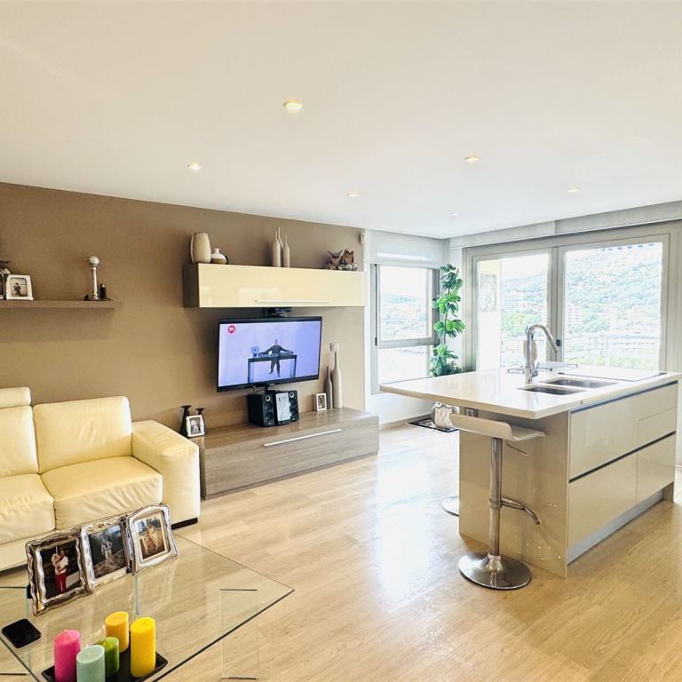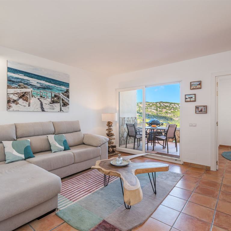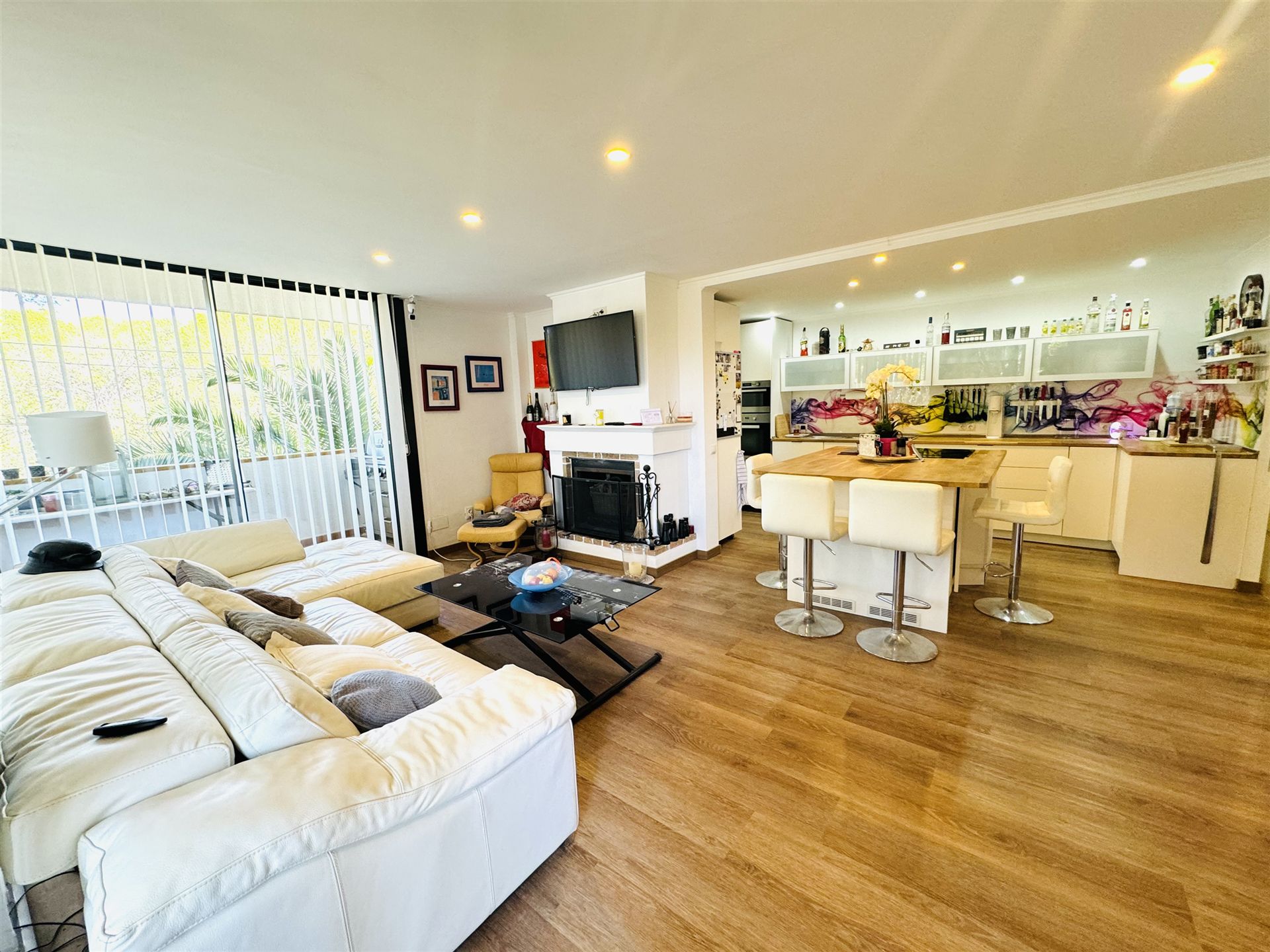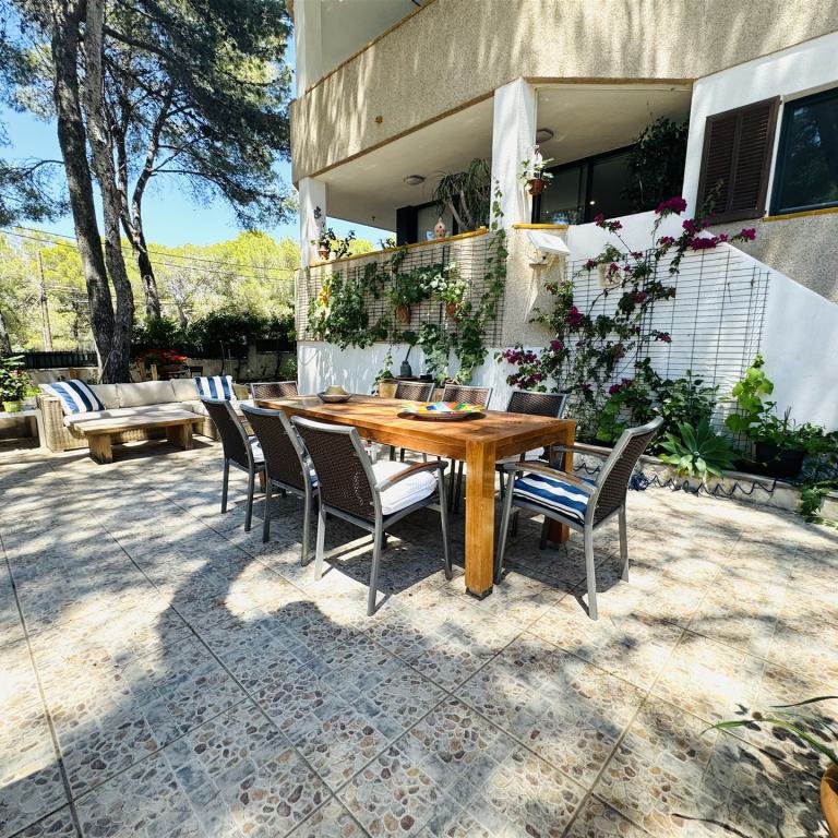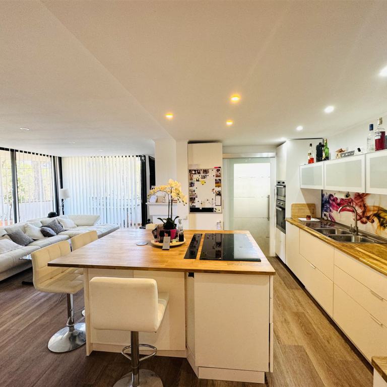 kernsaniertes Gartenappartment nahe Malgrat Felsen mit 90 qm Wohnfl., 24 qm Terrasse, 40 qm Garten, 3 SZ, 2 Bäder, offener Wohn-Essbereich mit Kamin, offene Einbauküche, Wirtschaftsraum, Kellerraum, Klima, Doppelverglasung, privater Stellplatz, G-Pool