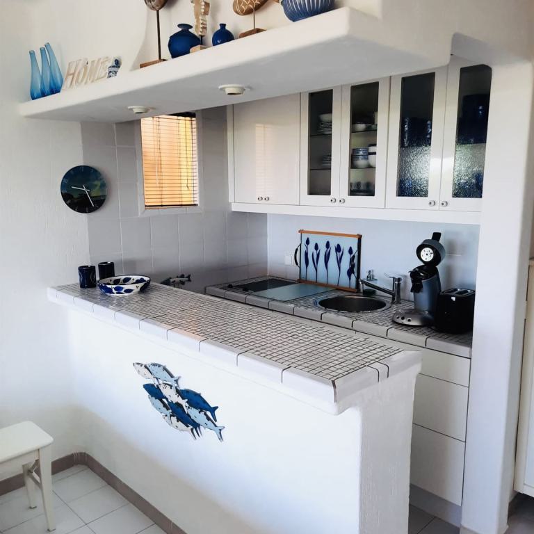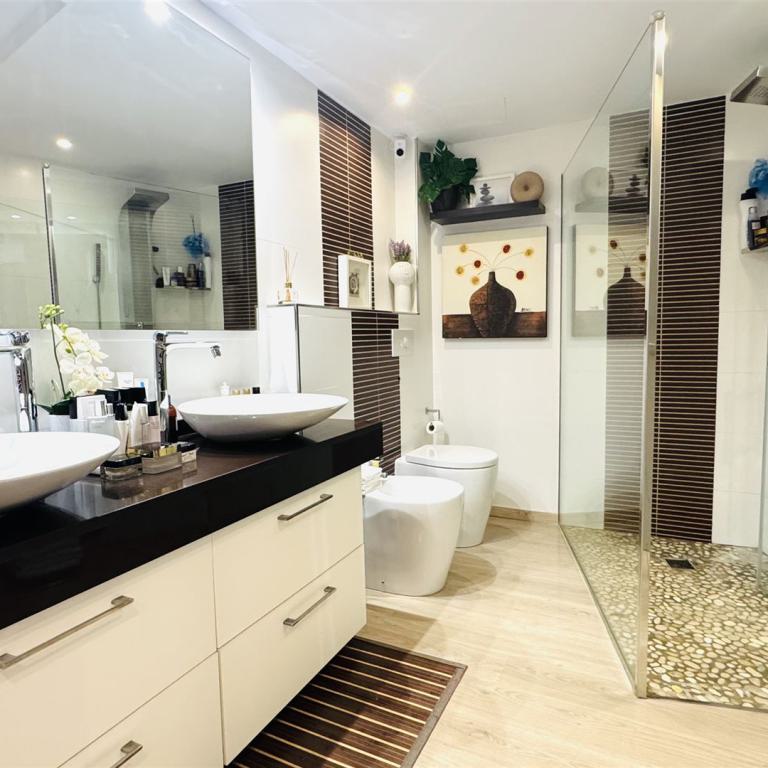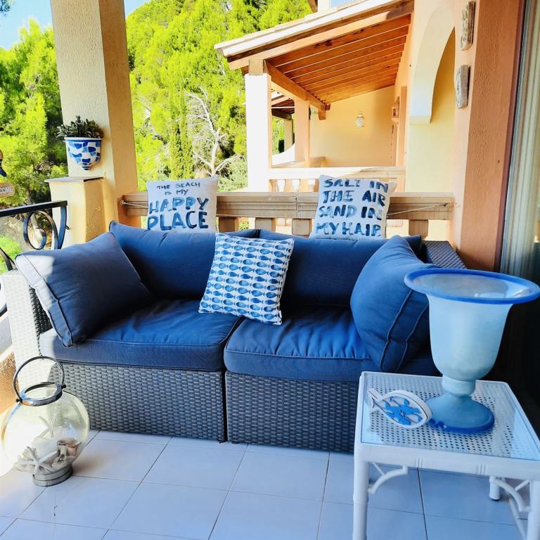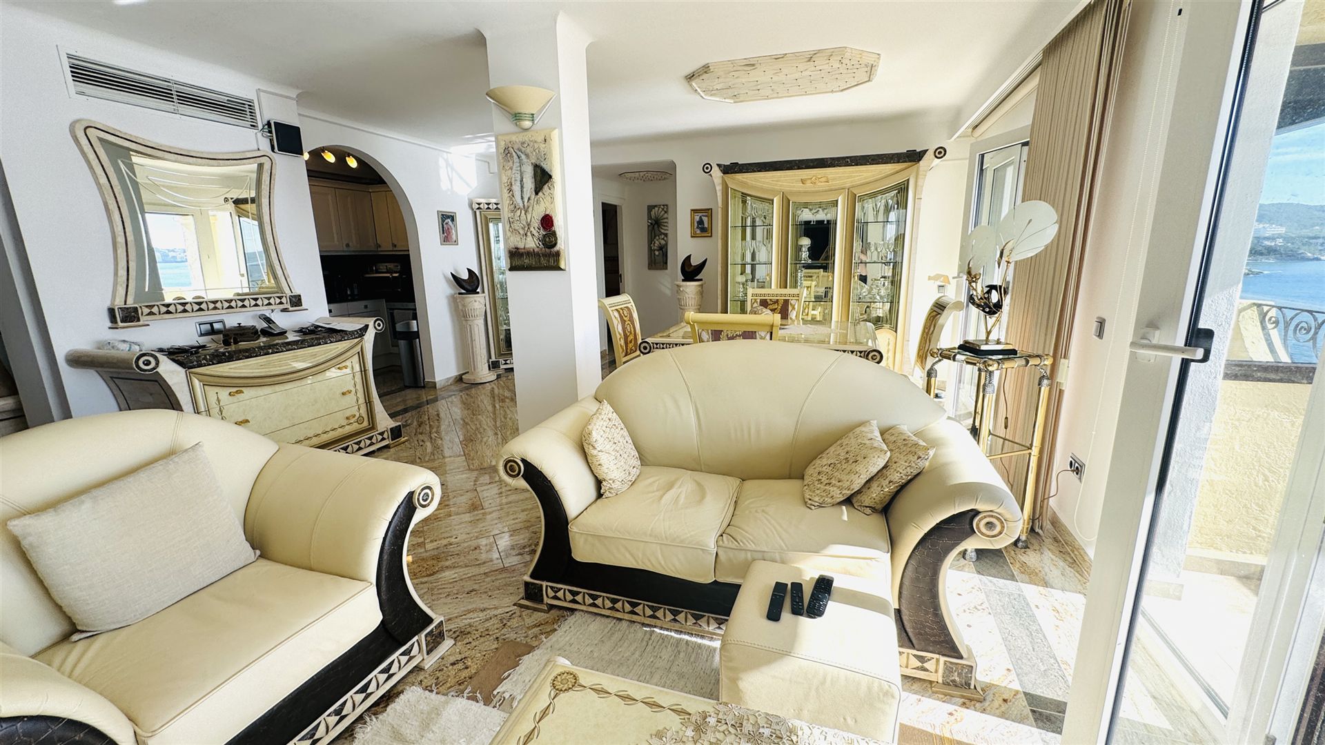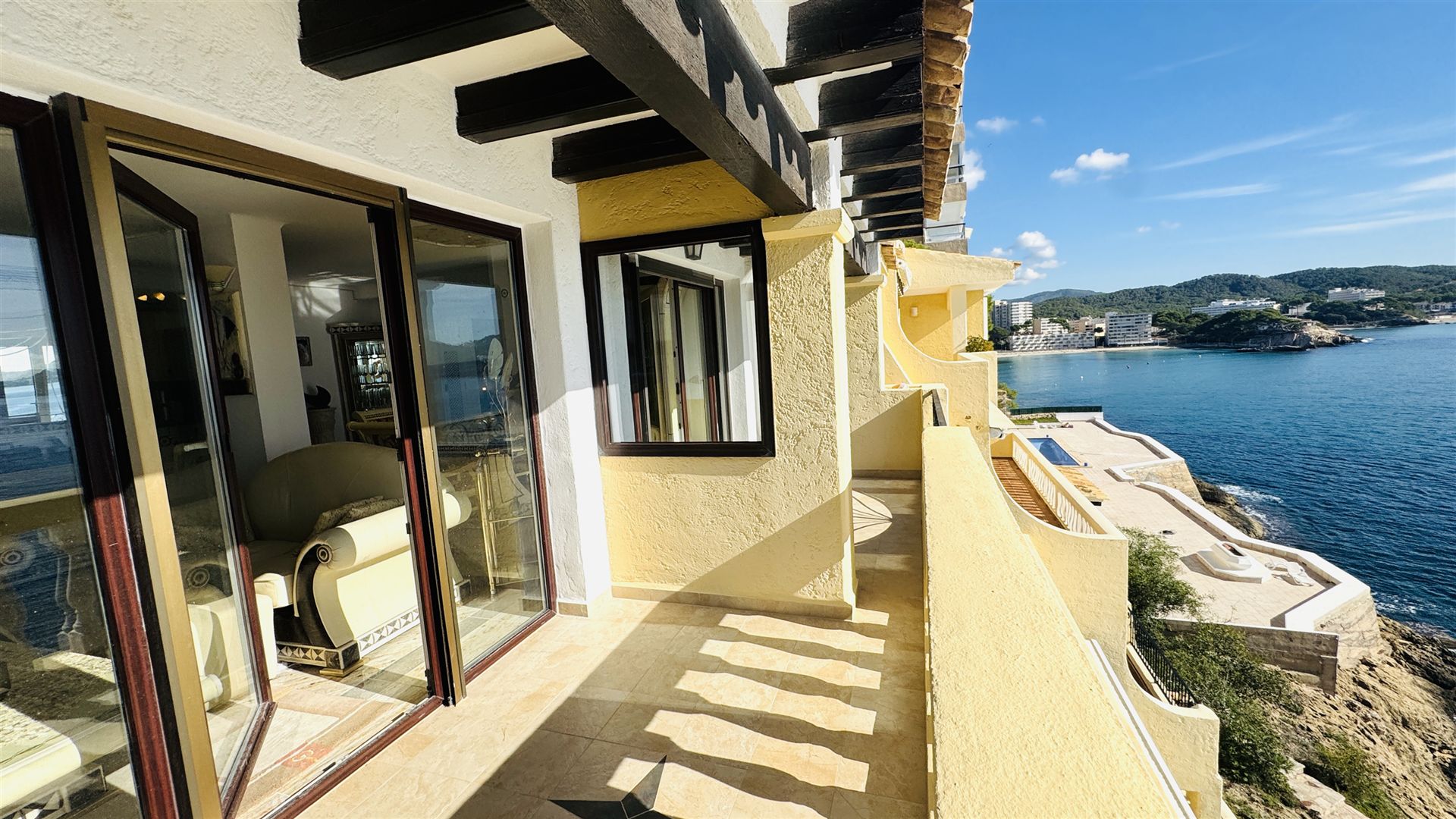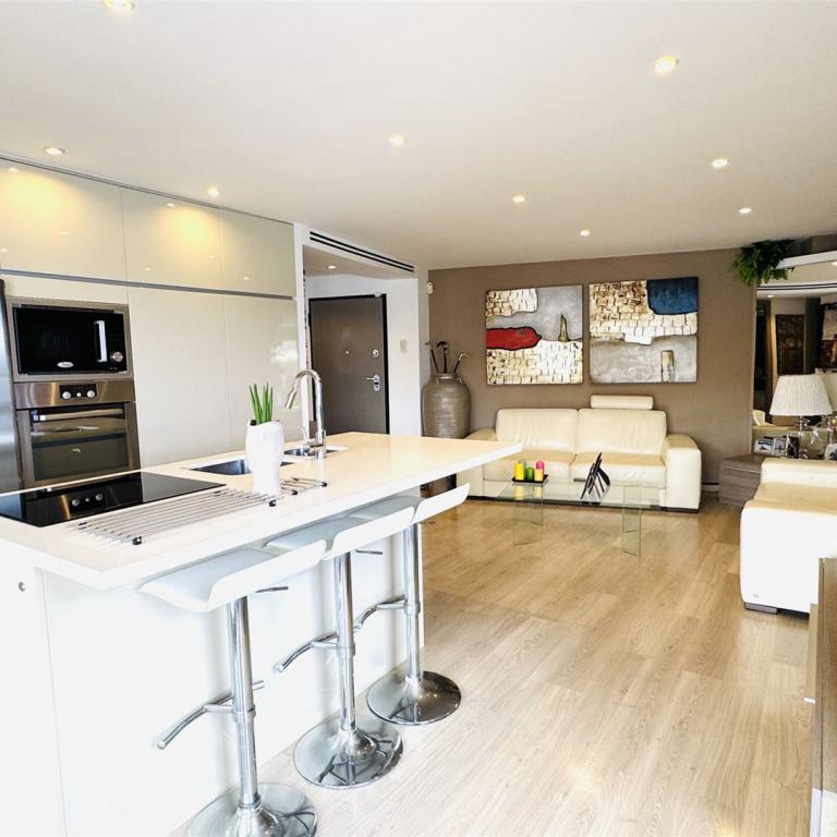 exclusive Meerblick Wohnung mit traumhaftem Meerblick und direktem Meerzugang, 114 qm Wohnfl., 3 SZ, 2 B ( 1 davon en suite), offener heller Wohn-Essbereich mit weißer Einbauküche, Abstellraum, großzügige Terrasse mit Südlage, Klima, Fußbodenheizung, italienische Designermöbel, freie Stellplätze, G-Pool, inkl. Garagenplatz im Ort, große Dachterrasse mit 55 qm und super Meerblick
