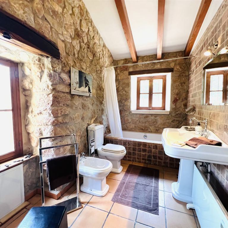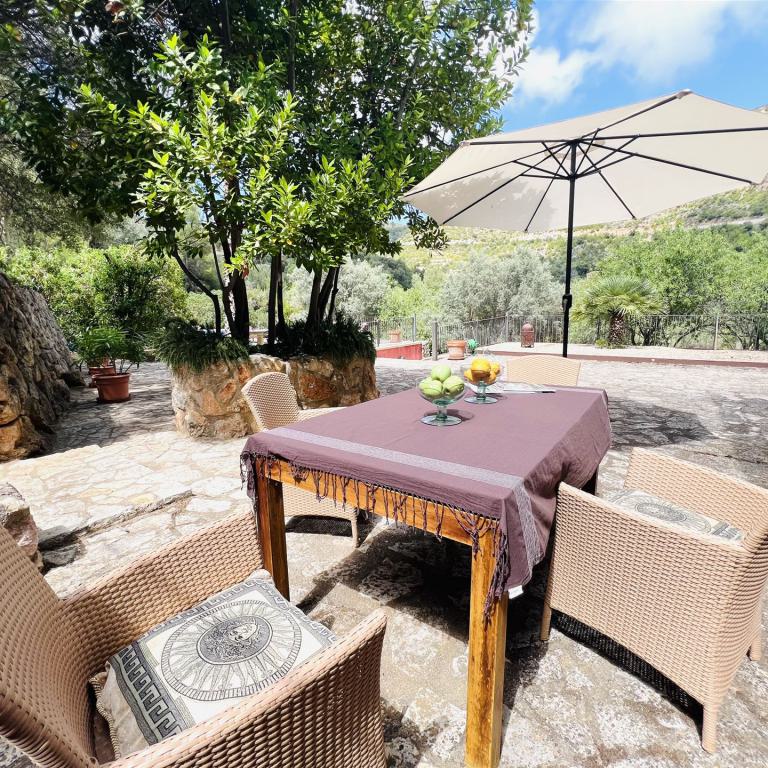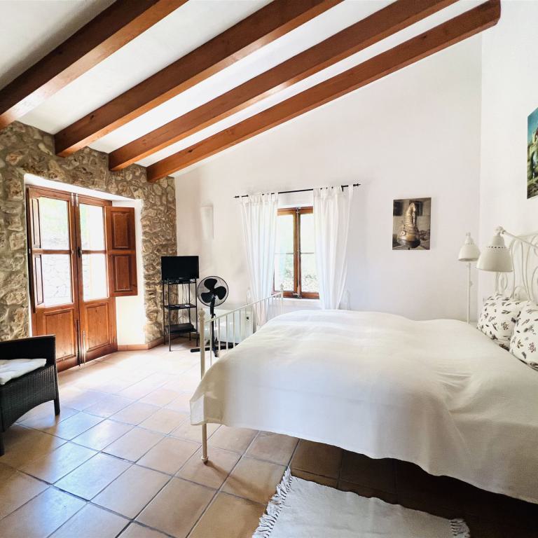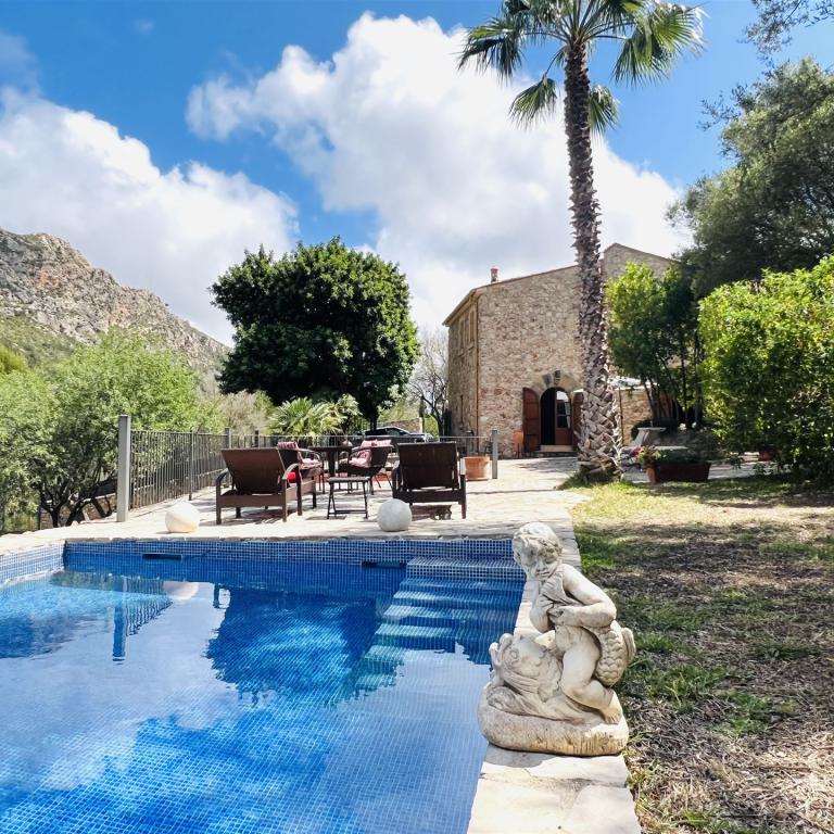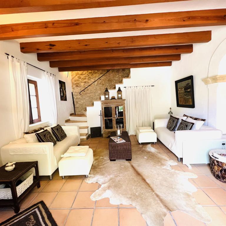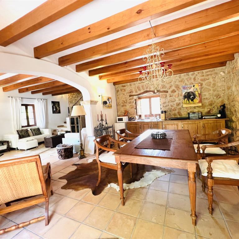 sehr schöne Finca in originalgetreuer Bauweise im Naturschutzgebiet gelegen, 2000 qm Grundstück, 160 qm Wohnfl., 2 SZ, 2 Bäder, geräumiges Wohn-Esszimmer mit Kamin, offene Wohnküche, Aussensommerküche, Pool, mehrere Terrassen, Gartenhaus, Landschaftsblick in Tal, mehrere Stellplätze, 5 Min. bis Andratx