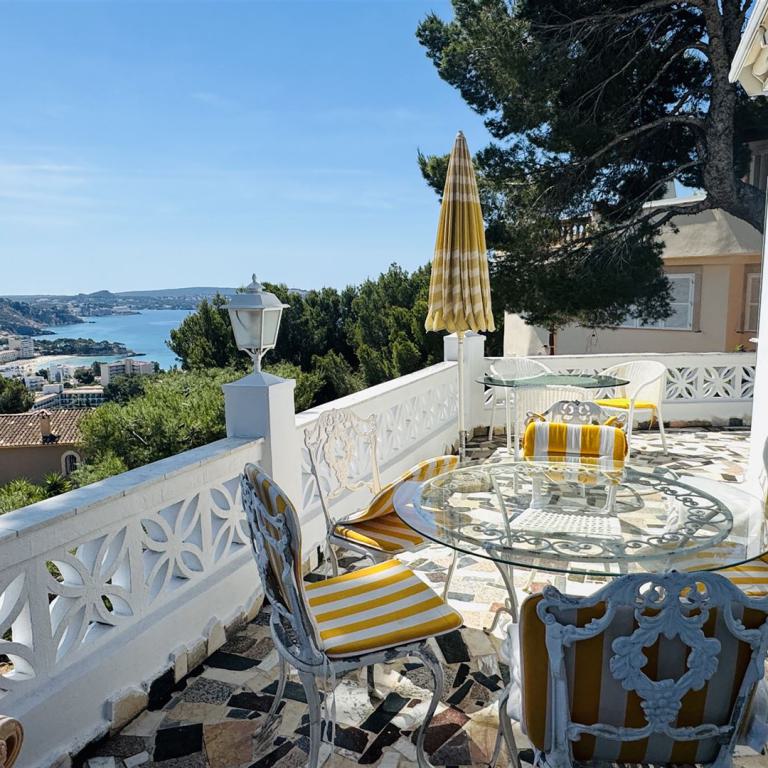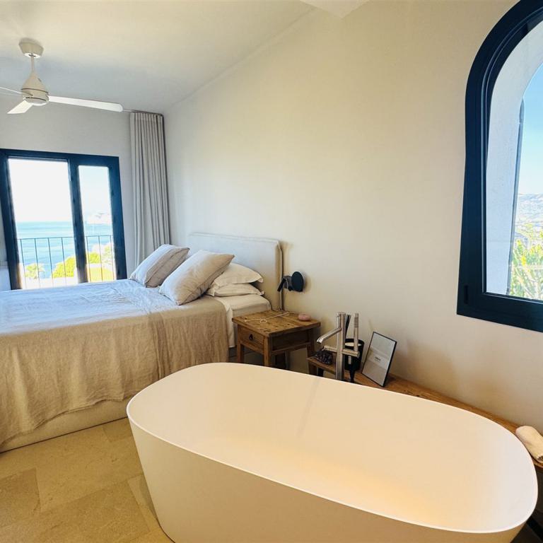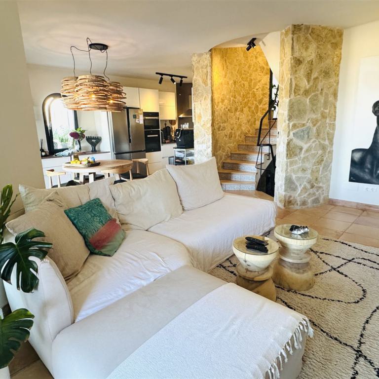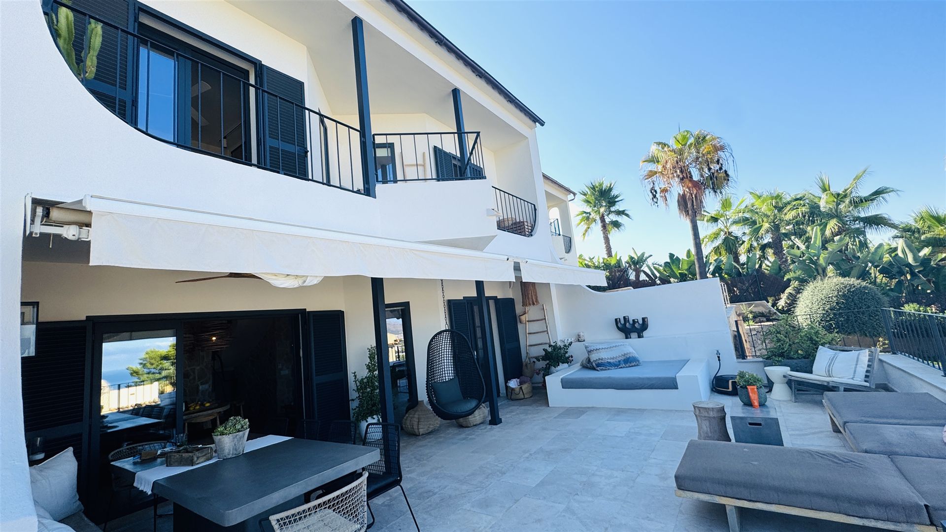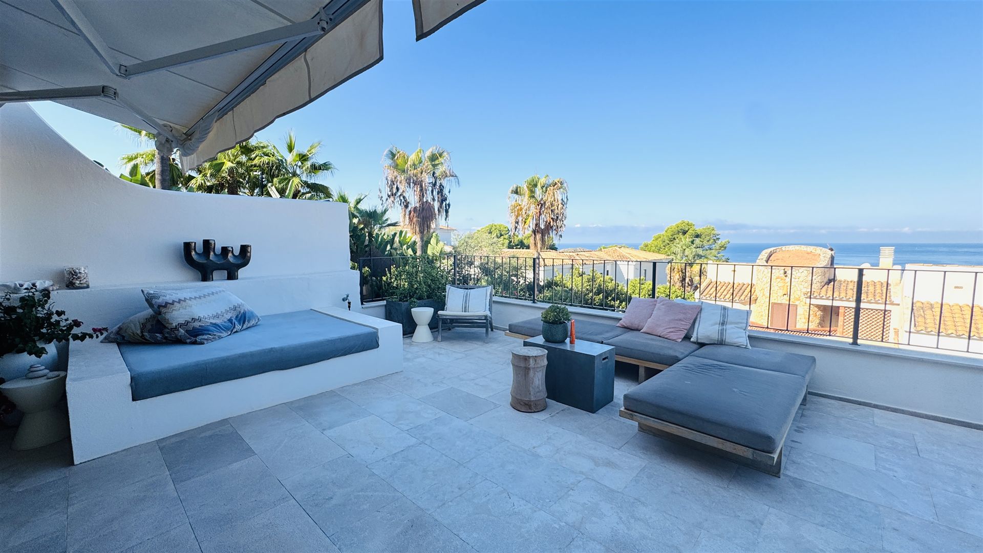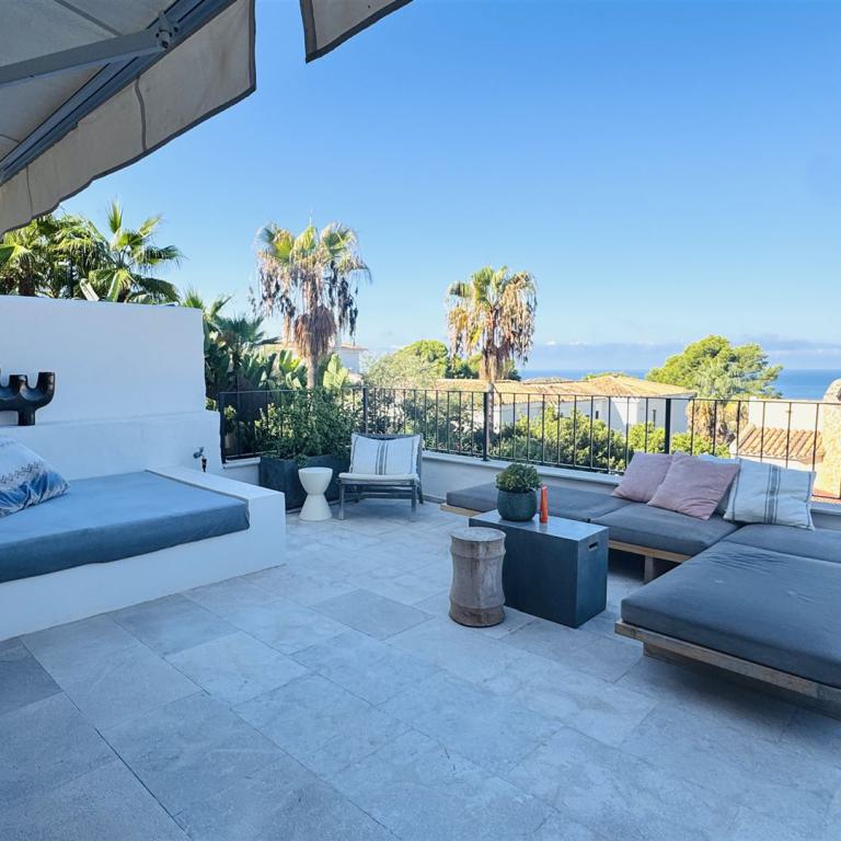 top renovierte Doppelhaushälfte mit einem super Meerblick in priviligierter Wohngegend, 247 qm Nutzfl., 163 qm Wohnfl., 2 SZ, 3 moderne Bäder, offener Wohn-Essbereich mit Kamin, offene moderne Einbauküche, Wirtschaftsraum, Kellerraum, Büroraum als Gästezimmer nutzbar, Klima, große Rundumterrasse, Dachterrasse mit einem schönen Meerblick, BBQ Bereich mit überdachter Terrasse, modern mediterraner Stil, nahe Golfplätzen und Yachthafen