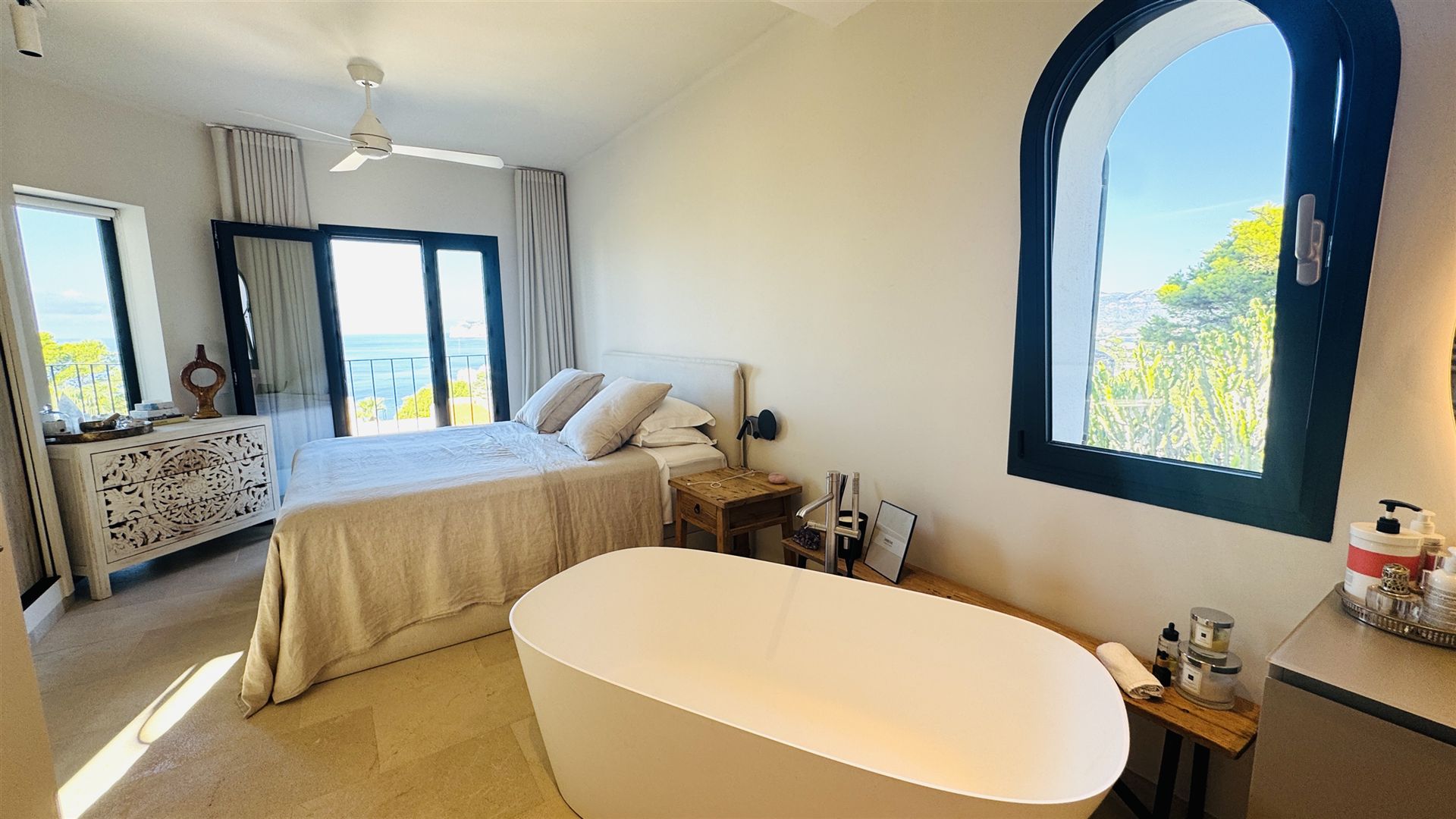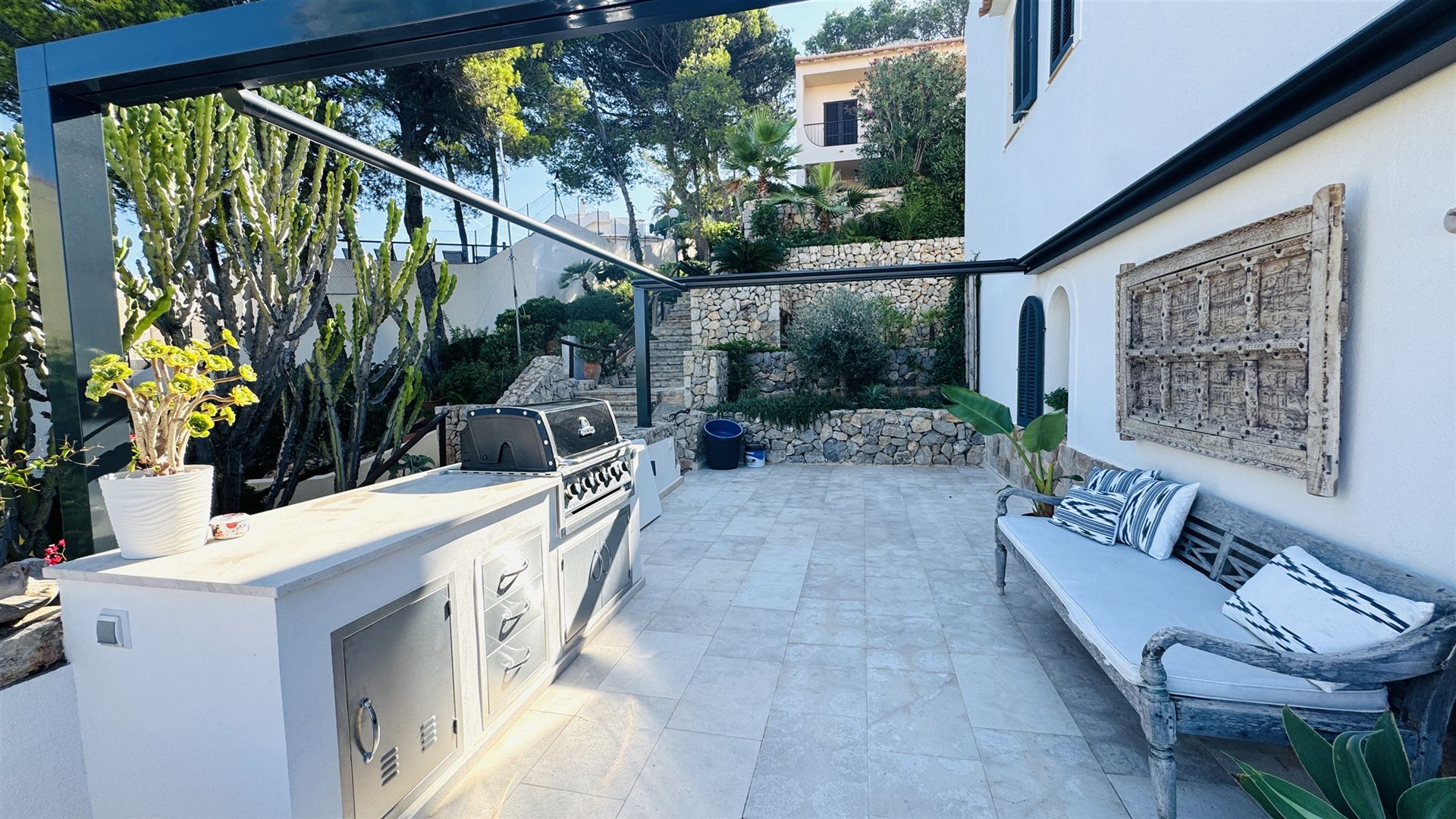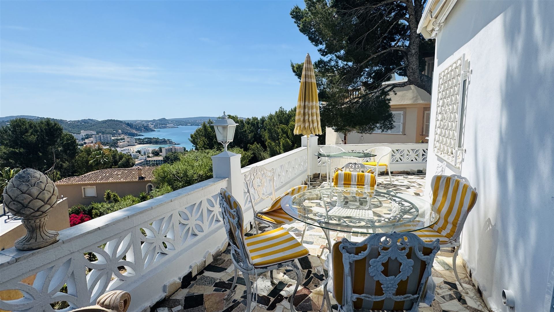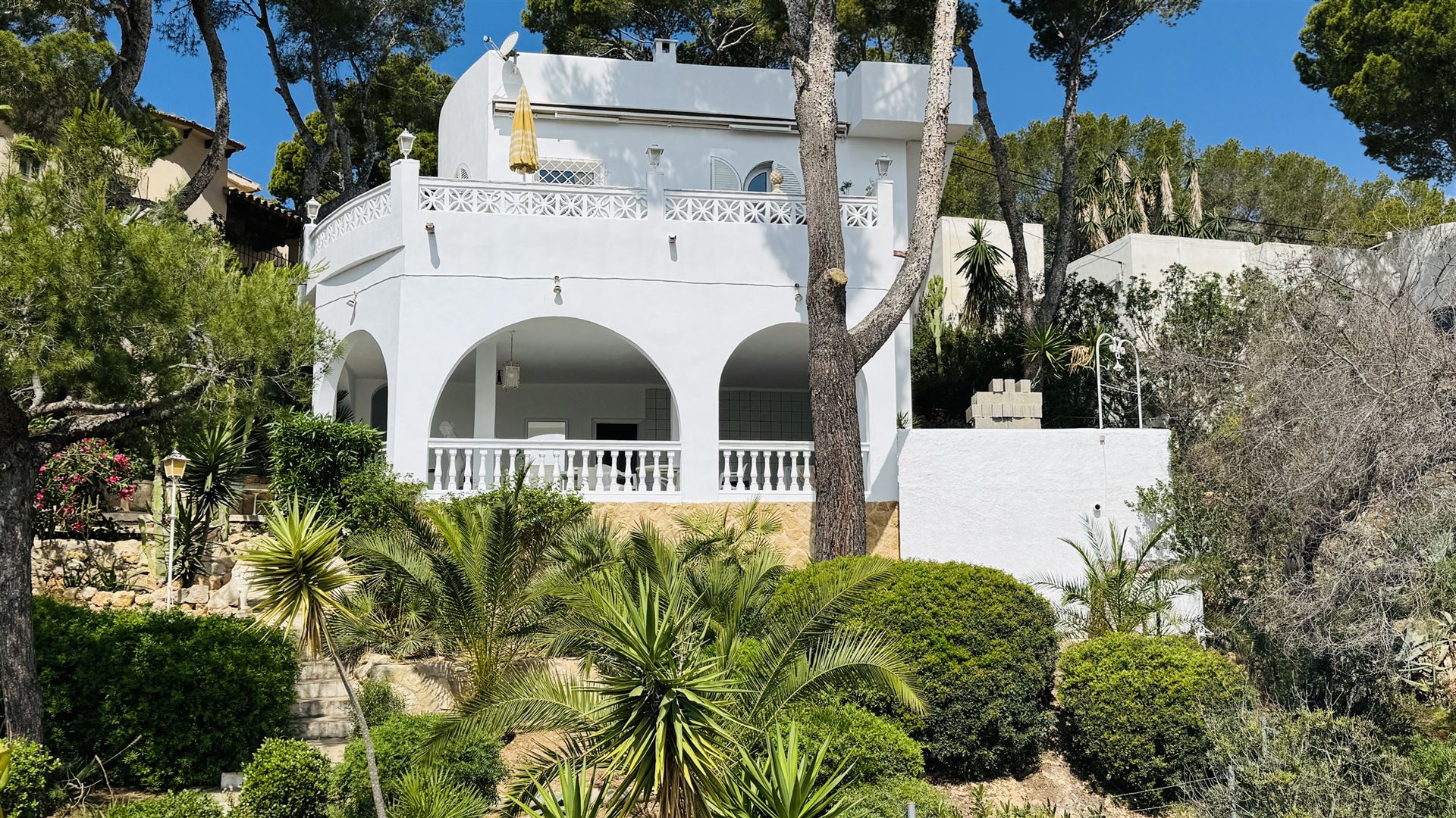 top renovierte Doppelhaushälfte mit einem super Meerblick in priviligierter Wohngegend, 247 qm Nutzfl., 163 qm Wohnfl., 2 SZ, 3 moderne Bäder, offener Wohn-Essbereich mit Kamin, offene moderne Einbauküche, Wirtschaftsraum, Kellerraum, Büroraum als Gästezimmer nutzbar, Klima, große Rundumterrasse, Dachterrasse mit einem schönen Meerblick, BBQ Bereich mit überdachter Terrasse, modern mediterraner Stil, nahe Golfplätzen und Yachthafen