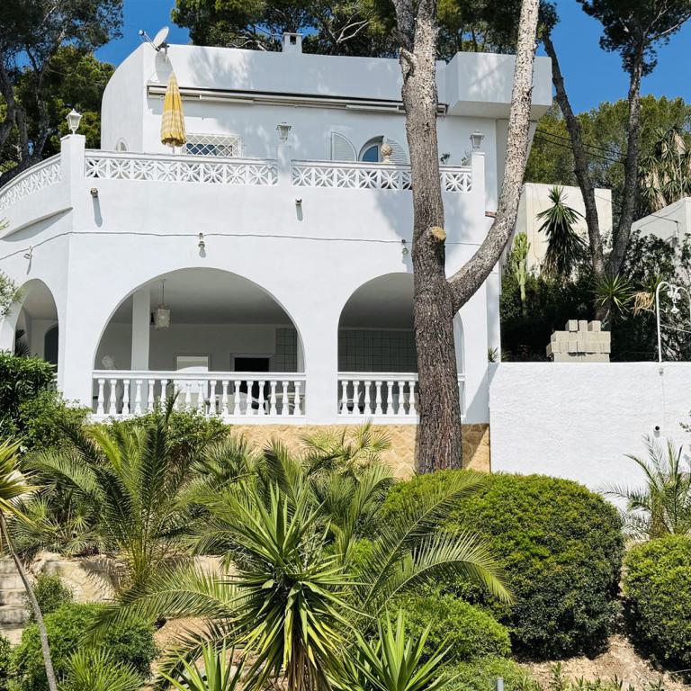 mediterranes Chalet mit Meerblick oberhalb von Paguera in ruhiger Residentenzone, 750 qm Grundstück mit Hanglage, 126 qm Nutzfläche, 2 SZ, 2 Bäder, Wohn-Esszimmer mit Kamin, Einbauküche, große Rundumterrasse, große Dachterrasse mit ca. 80 qm, Garten, Garage, Doppelverglasung, Abstellraum